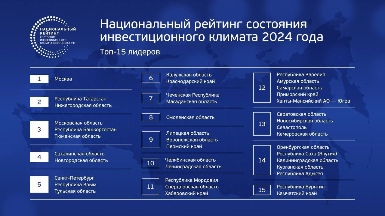 Лидером Национального рейтинга состояния инвестиционного климата вновь стала Москва. Вторую строчку заняли Татарстан и Нижегородская область, третью - Башкортостан, Московская и Тюменская области. На четвёртом месте Сахалинская и Новгородская области, на пятом - Санкт-Петербург, Крым и Тульская область. В общей сложности в ТОПе рейтинга (с 1 по 15 места) 40 регионов.
