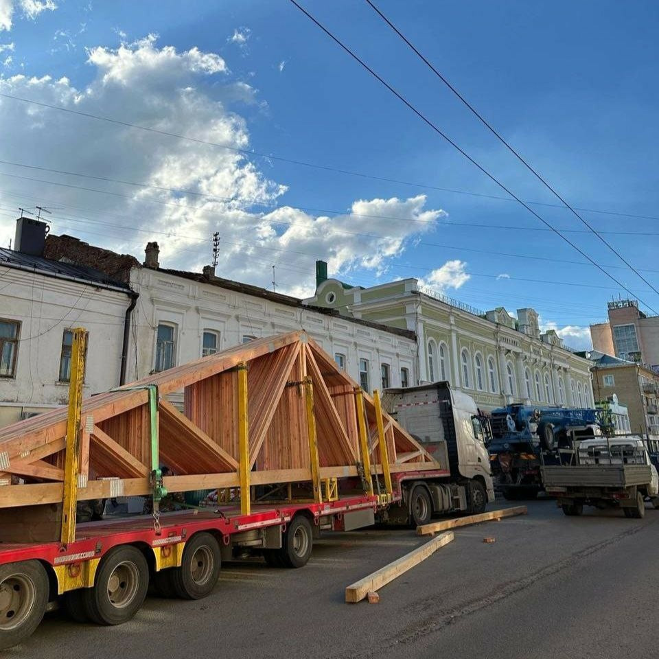 На данный момент подрядчик произвел полный демонтаж кровли и стропильной конструкции, приступив к восстановлению кирпичной кладки стен. Завершается установка мауэрлата. Примечательно, что для проведения ремонтных работ по спецзаказу была произведена готовая стропильная конструкция, собранная на специальных станках в заводских условиях.
