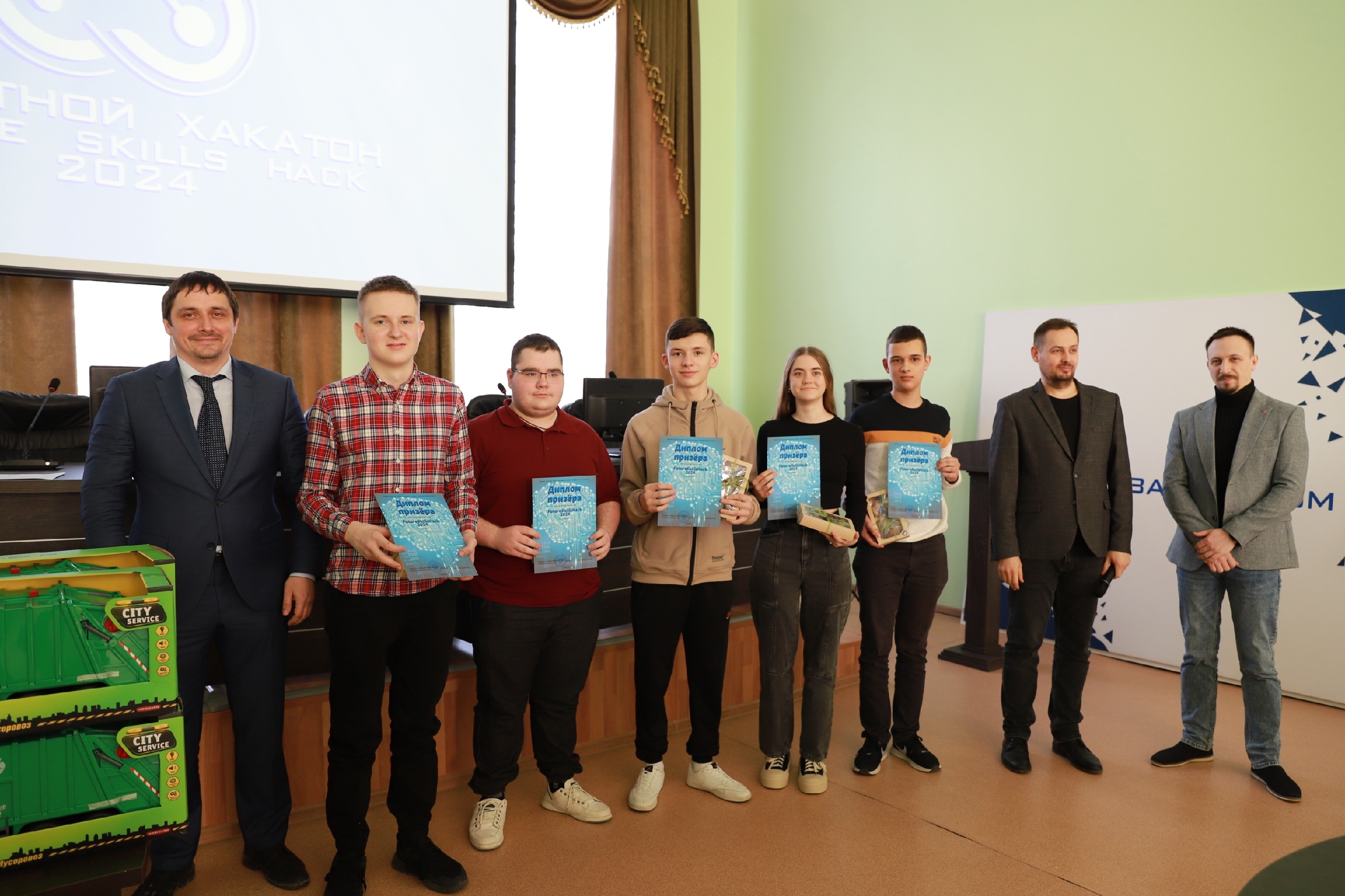 Участники команды, занявшей первое место, получили на память от «Тамбовской сетевой компании» яркие модели мусоровозов, а ребята, чьи команды заняли второе и третье места, были награждены сладкими призами от АО «ТСК». Наконец, отдельных подарков удостоились наиболее активные участники Хакатона – Кирилл Черкасов и Дмитрий Гусев.