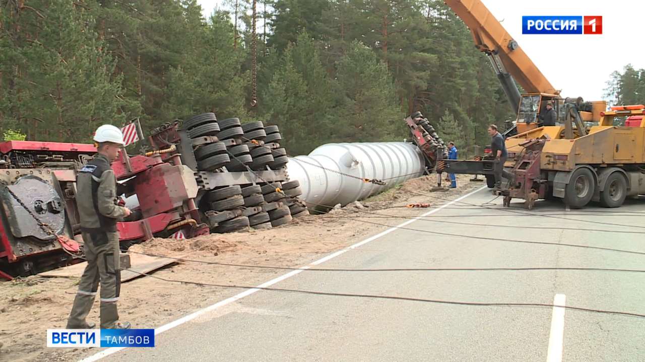 Точнее, ДТП с необычным участником - здесь перевернулся негабаритный трал, который перевозил элемент конструкции для нефтепереработки длиной 42 метра.