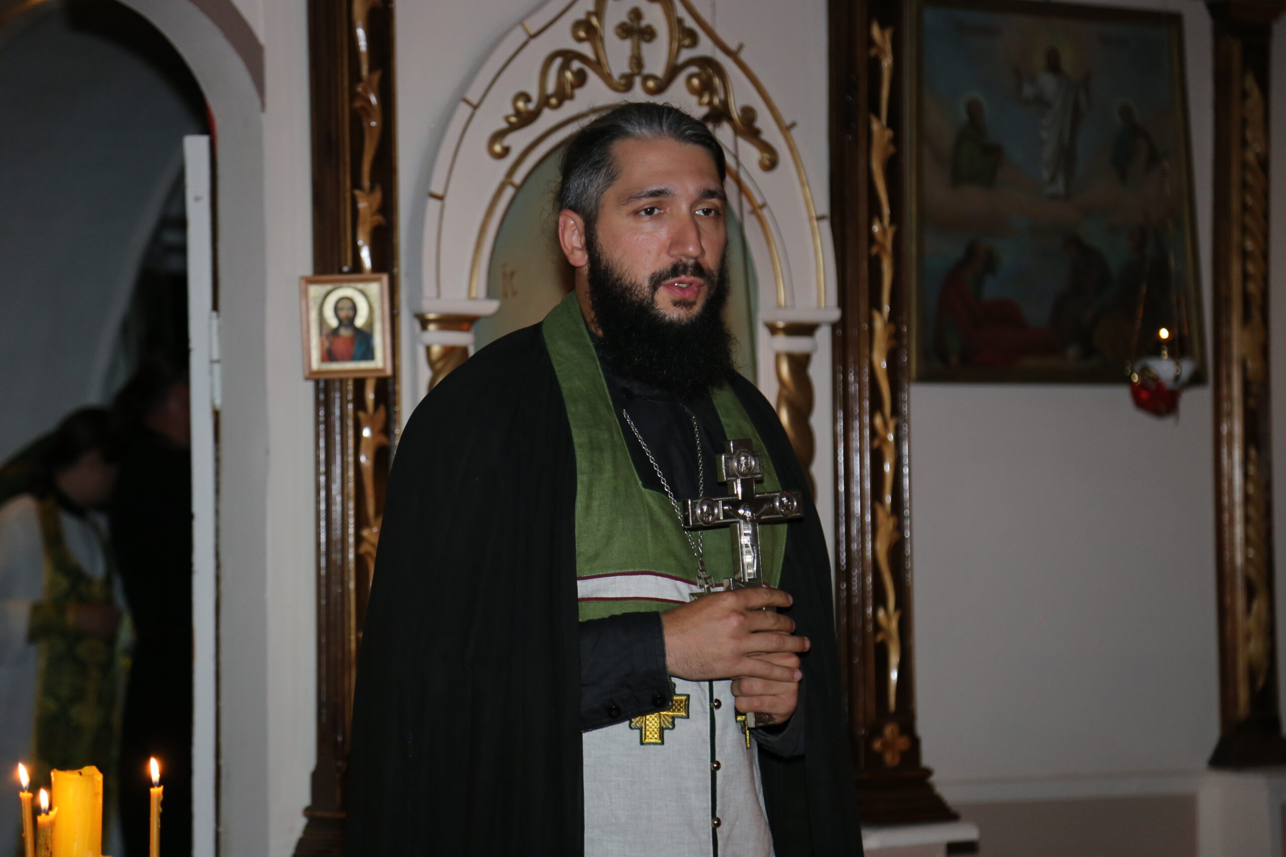 В завершении богослужения к прихожанам обратился настоятель Спасо-Преображенского храма иеромонах Прохор (Пожарницкий). Он поблагодарил собравшихся, отметив, что несмотря на плохую погоду и будний день, они смогли приехать, смогли поучаствовать в богослужении. Отец Прохор рассказал о святых преподобных Сергие и Германе, Валаамских чудотворцах. Рассказал о том, что более ста лет назад в этом месте жили Валаамские монахи, которые начинали здесь монашеский путь.