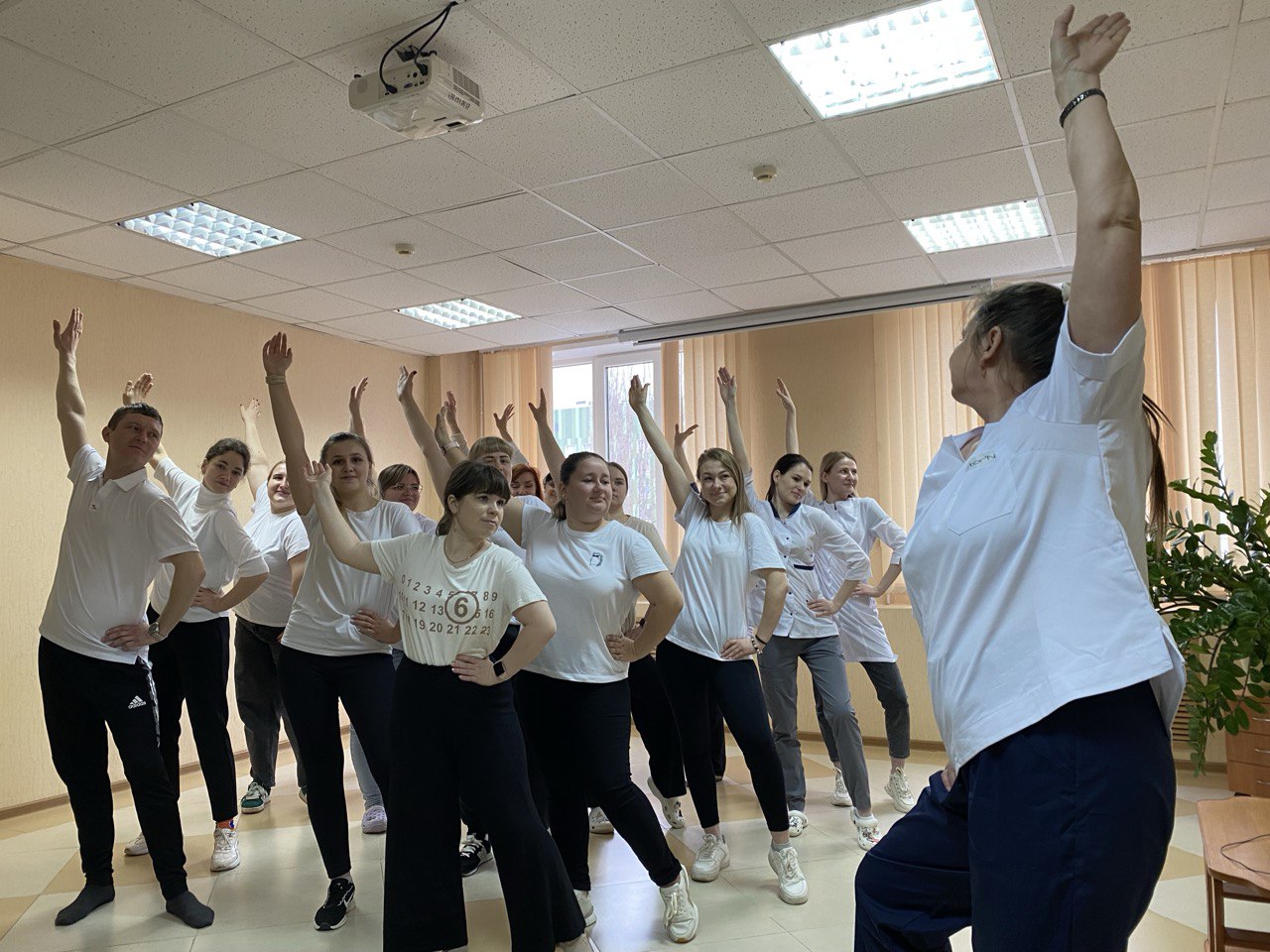 Сотрудники ГДП имени В.Коваля приняли участие в массовой зарядке с инструктором ЛФК отделения восстановительного лечения - Дворяшиной Татьяной Евгеньевной в рамках Всемирного дня здоровья.