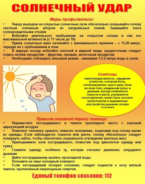 Длительное перегревание организма или воздействие прямых солнечных лучей на непокрытую голову может привести к тепловому (солнечному) удару. Солнечный удар может произойти как во время пребывания на солнце, так и через 6-8 часов после этого.