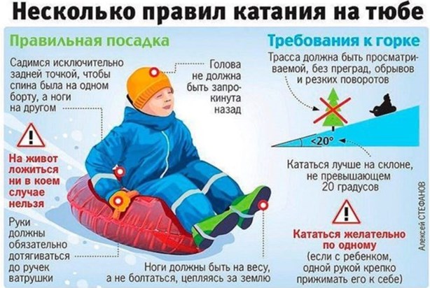 Тюбинги по-другому называют ватрушками. Они состоят из чехла и надувной камеры. Камеру надувают при помощи насоса или другого механизма, после чего тюбинг набирает объем. Широкое распространение транспорт получил из-за скорости. При катании с горы малыш может развить скорость более 80 км/ч. Соблюдать правила при таком движении затруднительно.